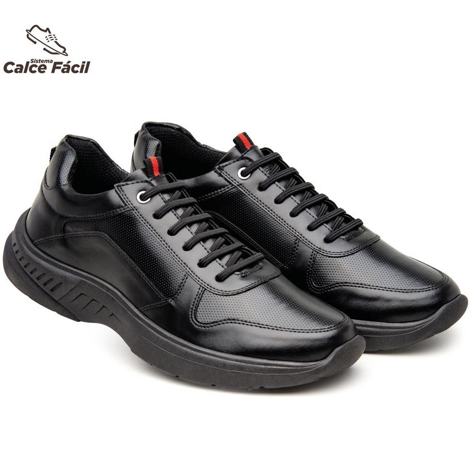 Tênis Sapatênis Casual Masculino Em Couro Sintético Calce Fácil Preto Com Solado Preto